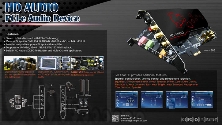「SC808」は、D/AコンバーターにWolfsonの「WM8741」、オーディオプロセッサーにC-Mediaの「CMI8888」を採用したサウンドカード。