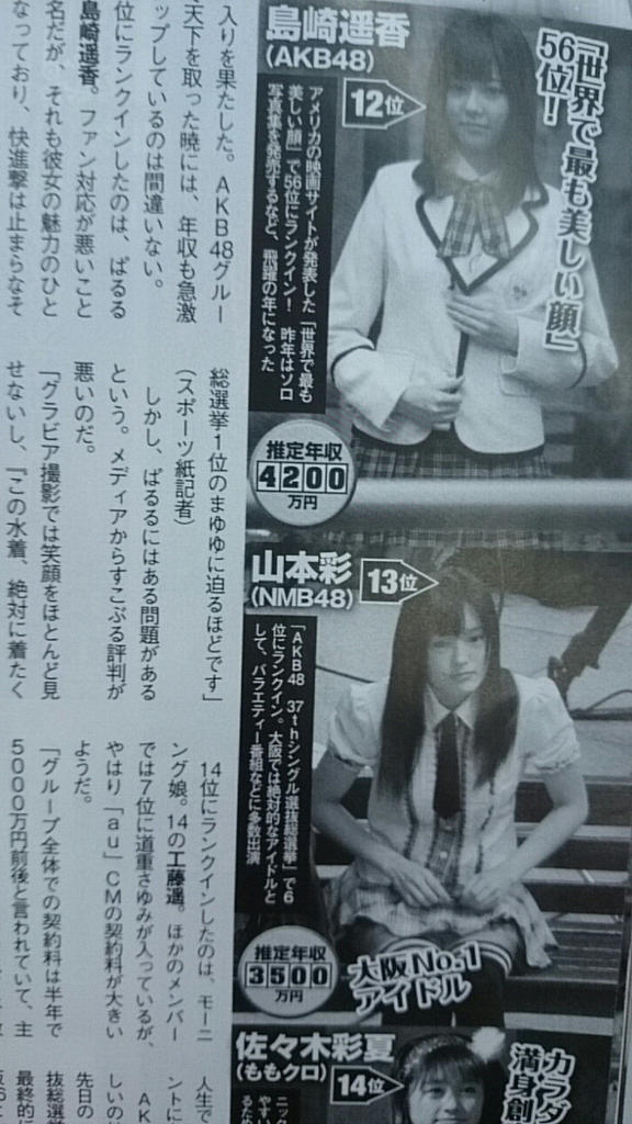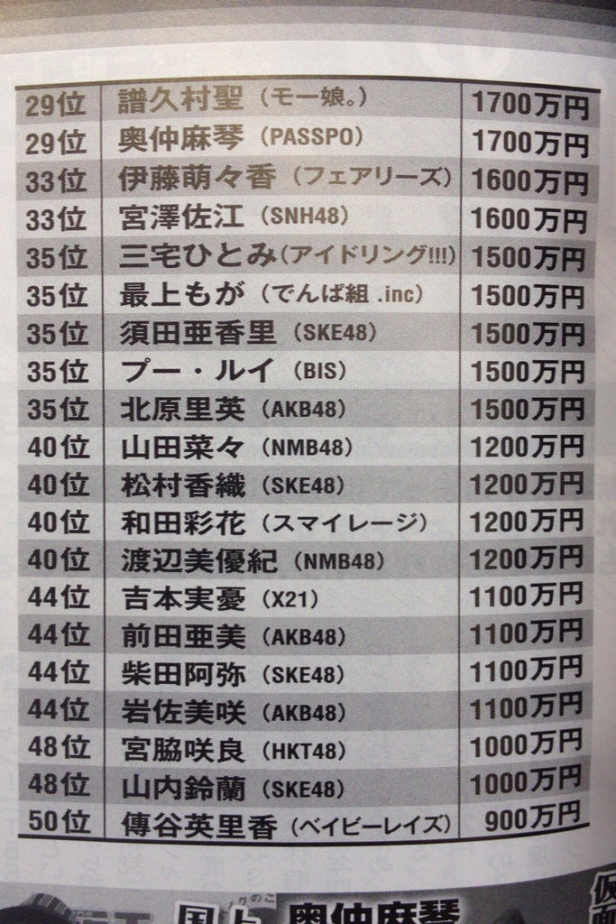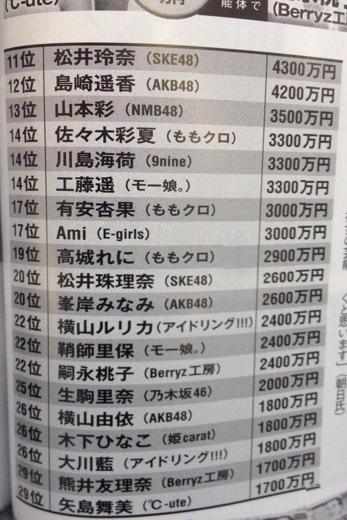 なお、同誌によるギャラランキングの1位は、HKT48・指原莉乃で推定年収は6800万円。